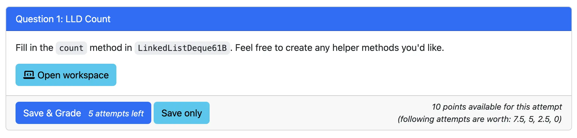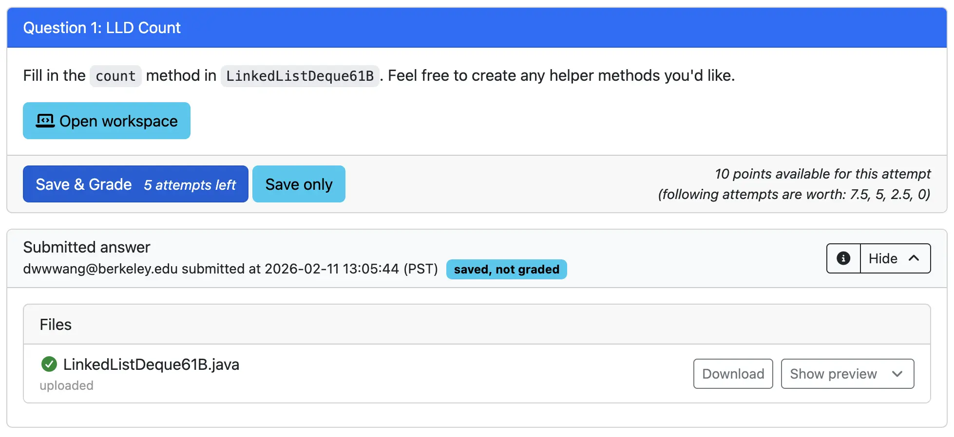 Upon successful submission, you will see your submission being graded. Once the autograder has completed grading it, you will see your score for this question. If you receive a full score, you will not be allowed to make any further submissions for that question.