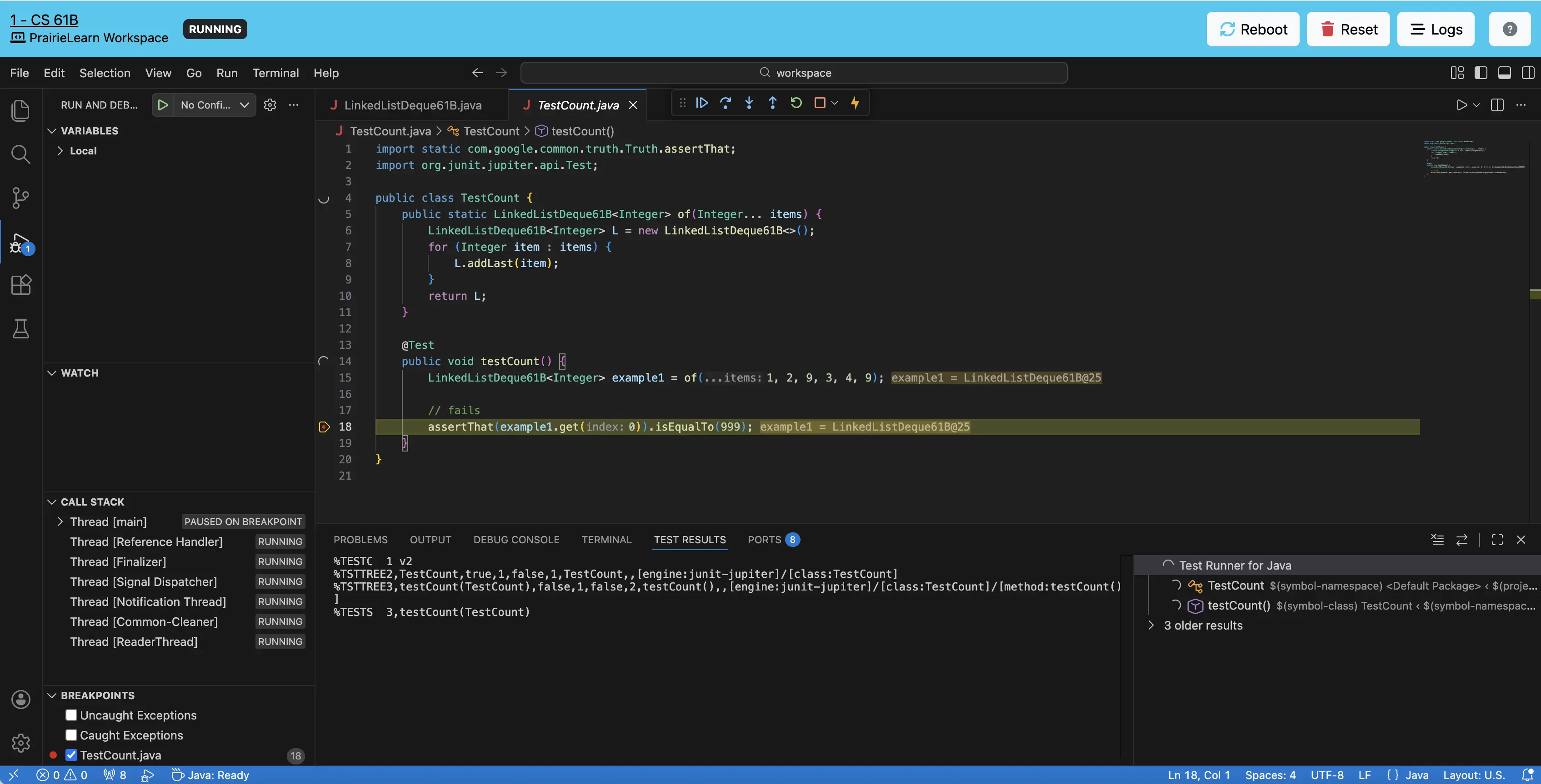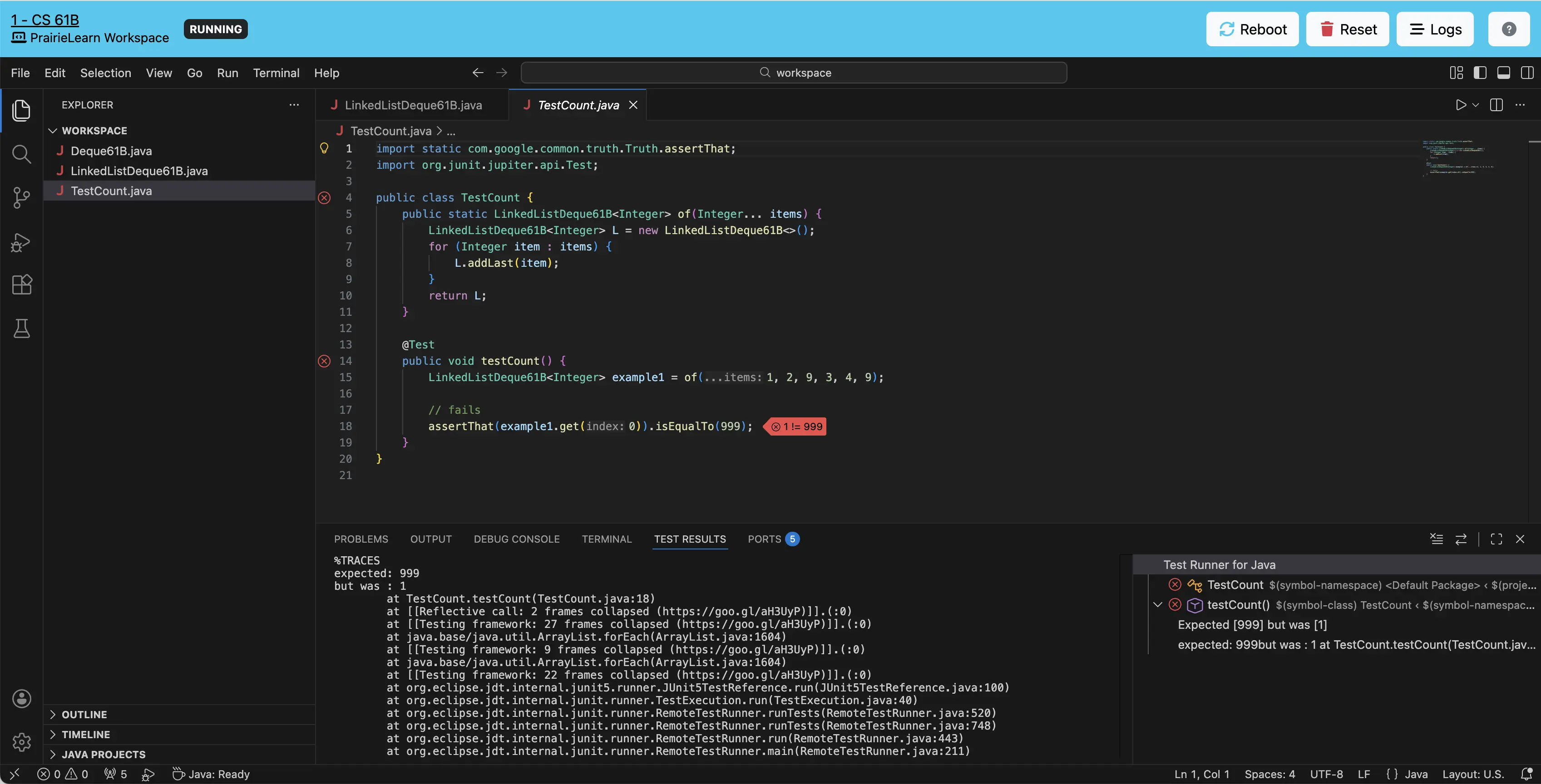 Double-click on the LinkedListDeque61B.java file as well as the TestCount.java file. Try running the TestCount.java file by clicking either the green play button next to public class TestCount or public void testCount(), both will run the only test in the file. You should see the test fail, as well as an output in TEST RESULTS. Clicking the now red X’s will run the test again. Here, you’ll be able to see the results of running your local tests.