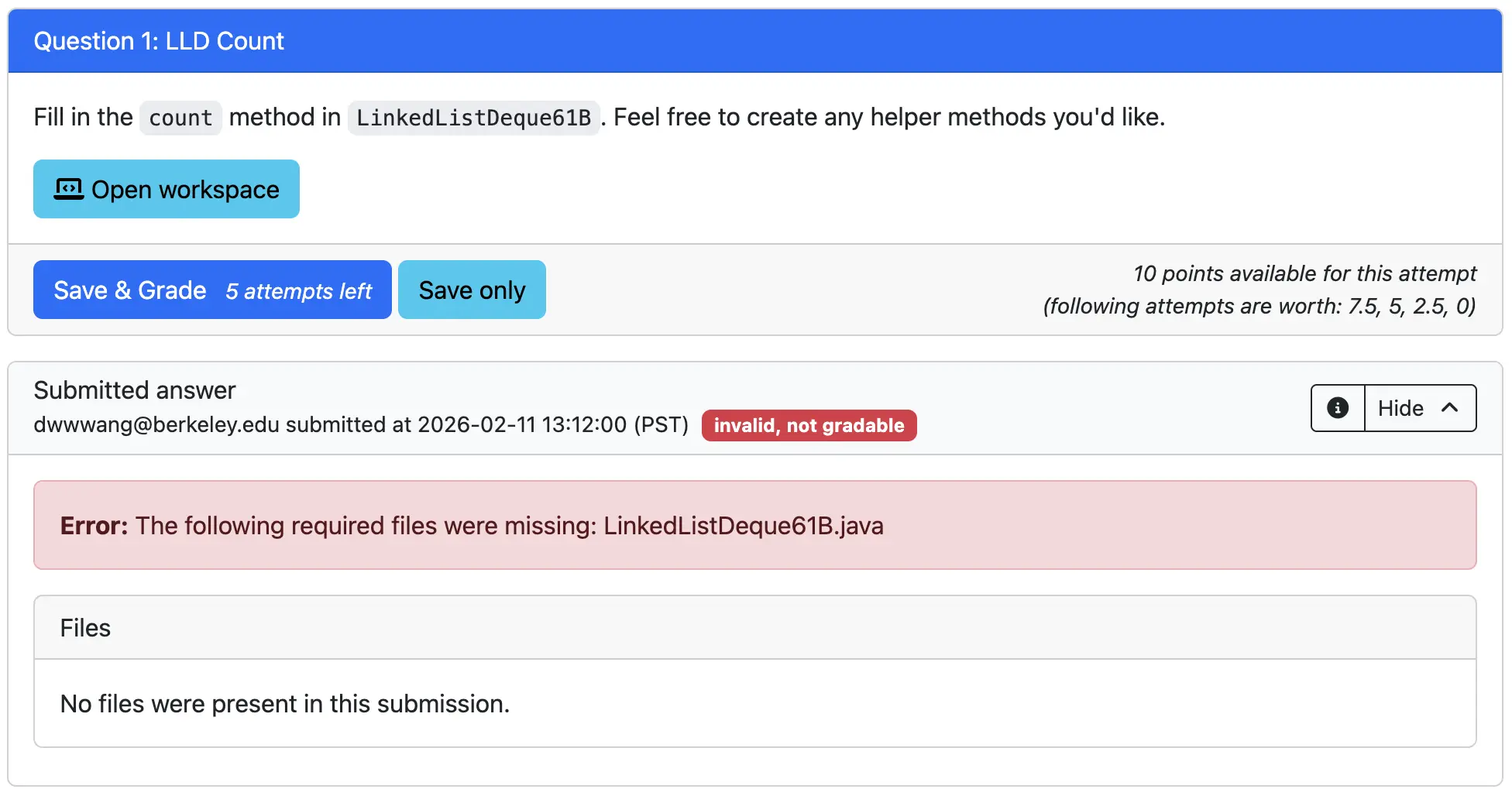 If you submit your code for grading prior to opening your workspace, it will not count as a graded submission and show the following error page. This can also happen if there are compilation errors in your own code or when running the autograder tests. If this happens, fix them and try again.