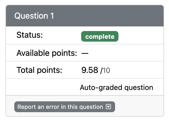 \[m_2 = 100\% - [(100\% - 95\%) * 0.25] = 98.75\%\]Expanding on this example, if your second submission scores $x_2 = 95\%$ again, then the maximum possible score $m_3$ you would be able to get on the third submission is: