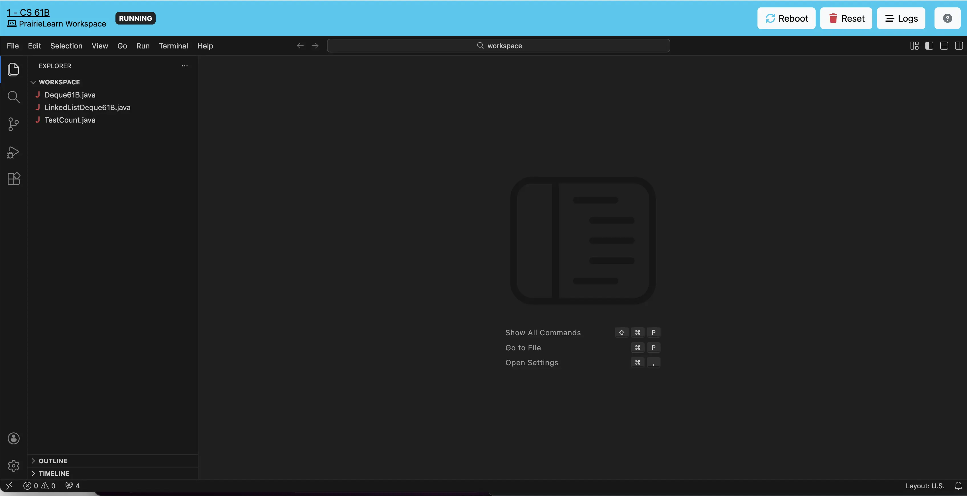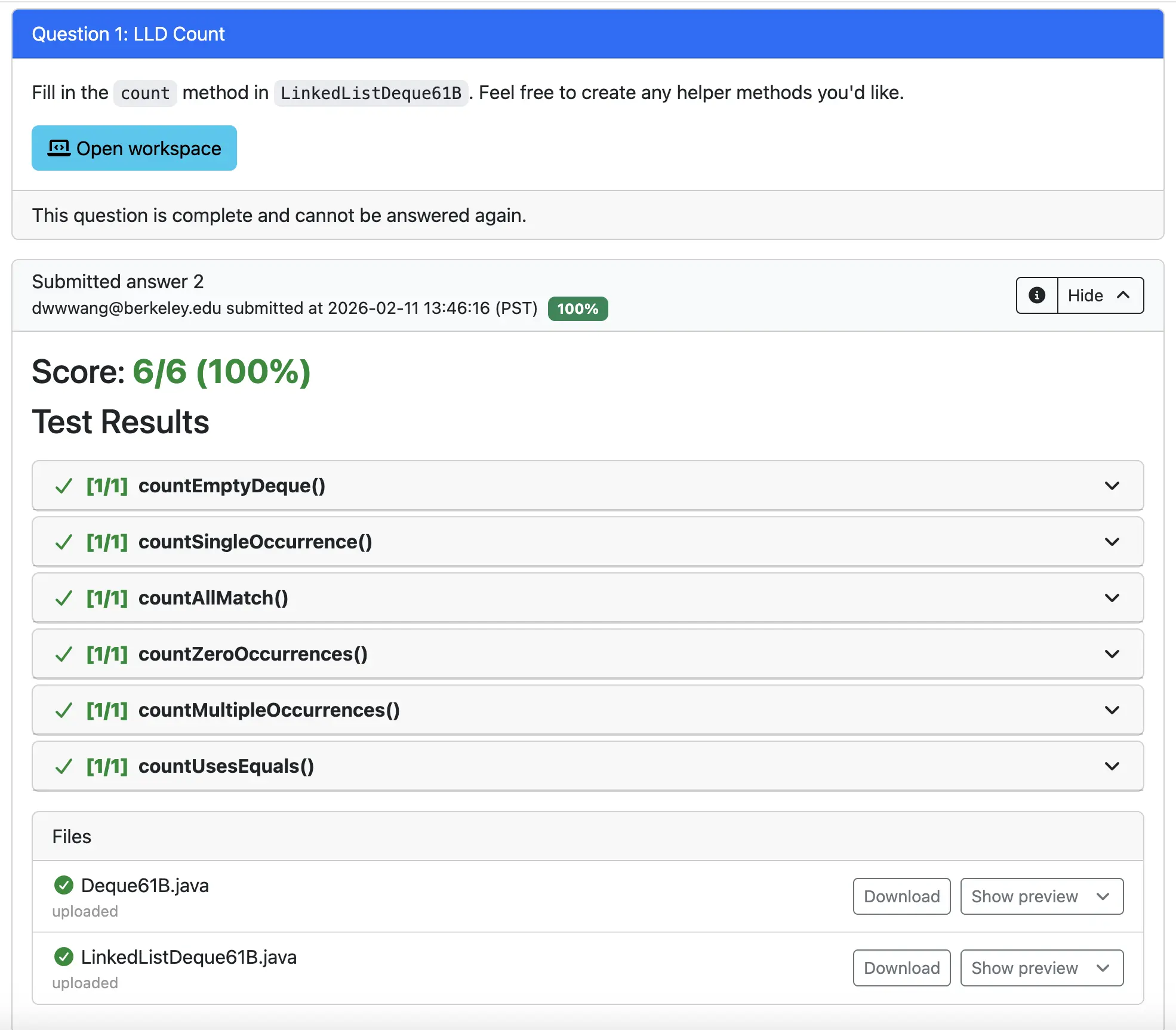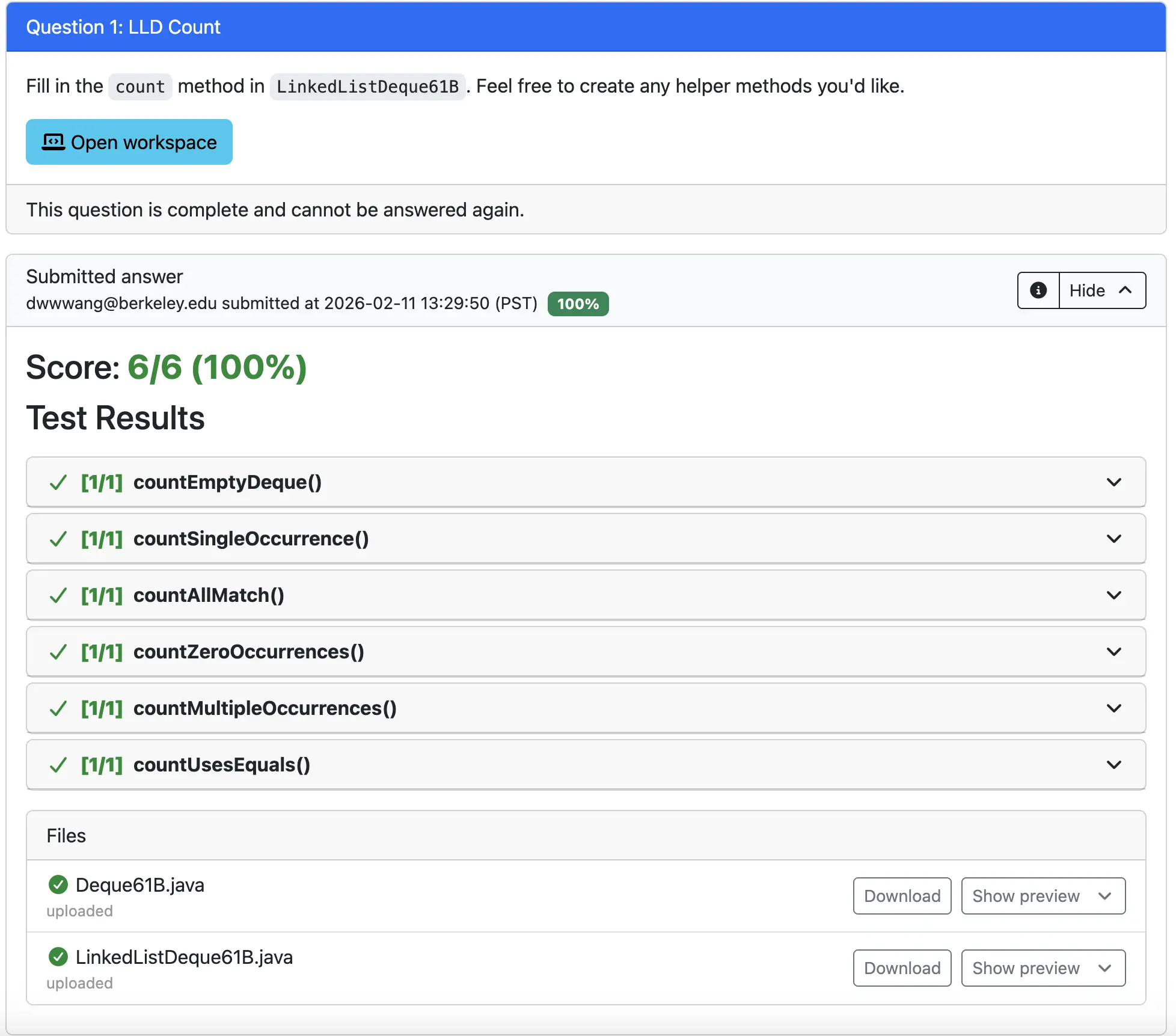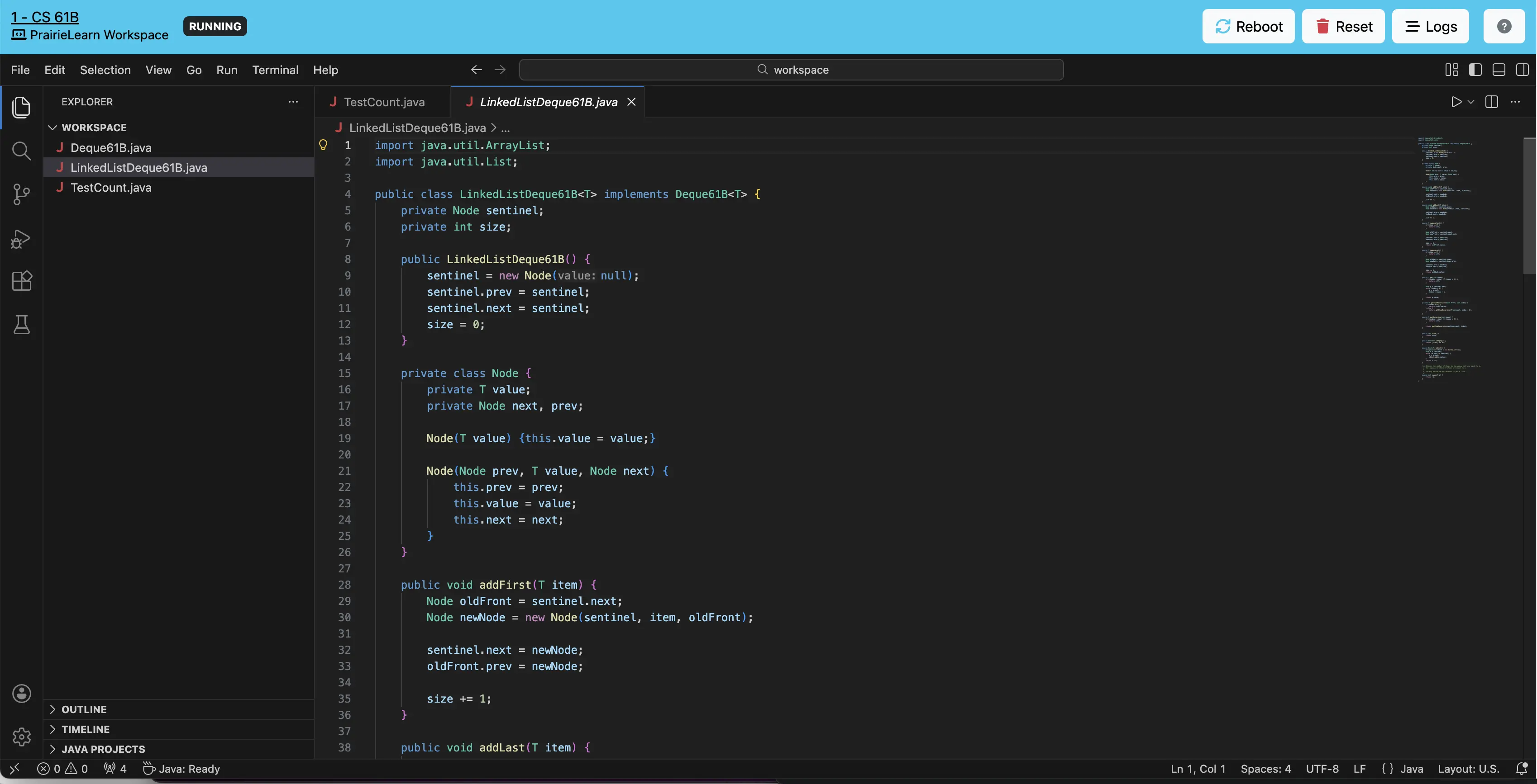 Now, you should be able to code inside both TestCount.java and LinkedListDeque61B.java by directly typing into each file.