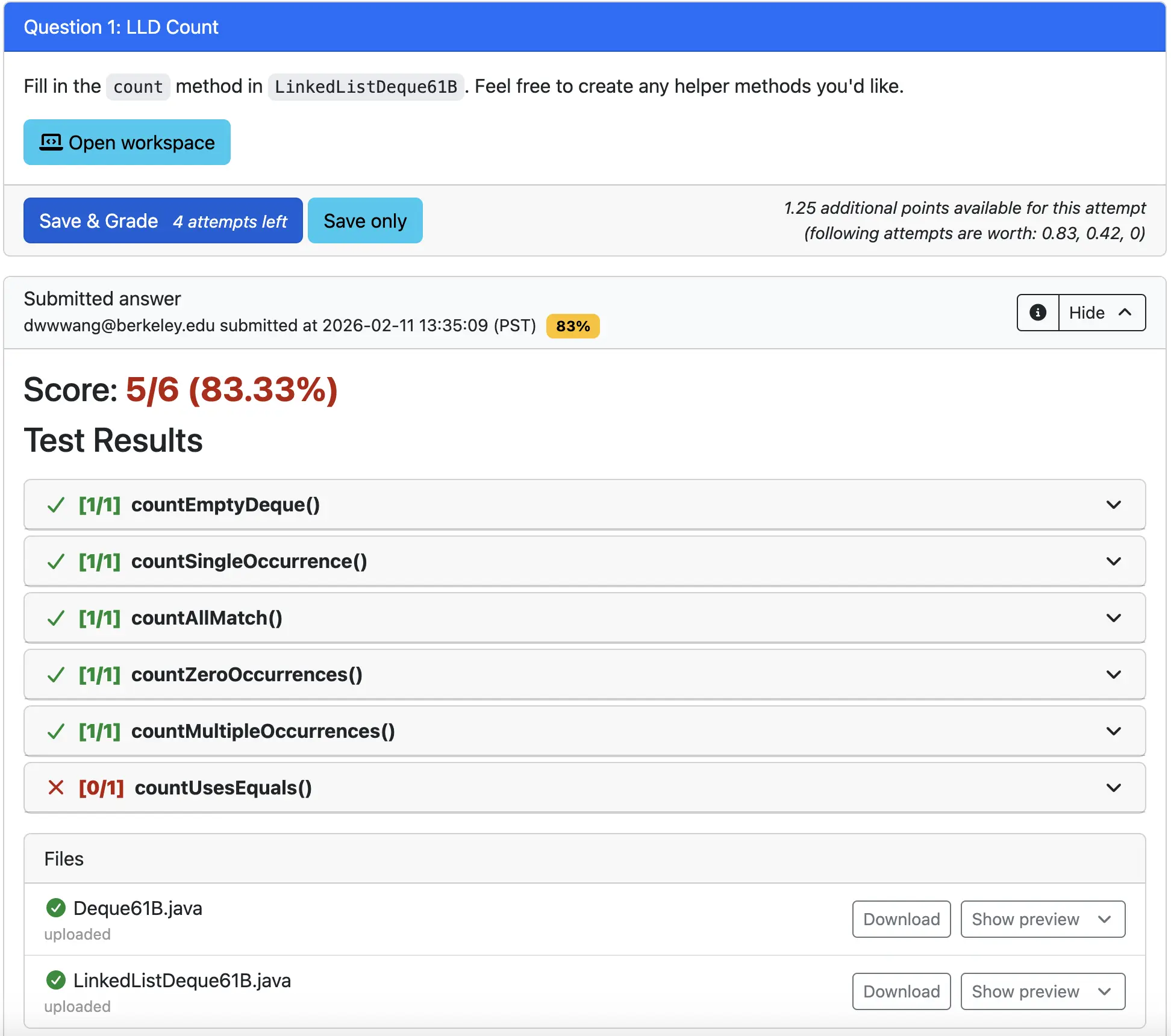 In the example below, we used == instead of .equals when comparing each element and checking for equality, causing us to fail the countUsesEqual() test and get a score of 83.33%. If you submit the assignment or assessment as is, this would be your final score.