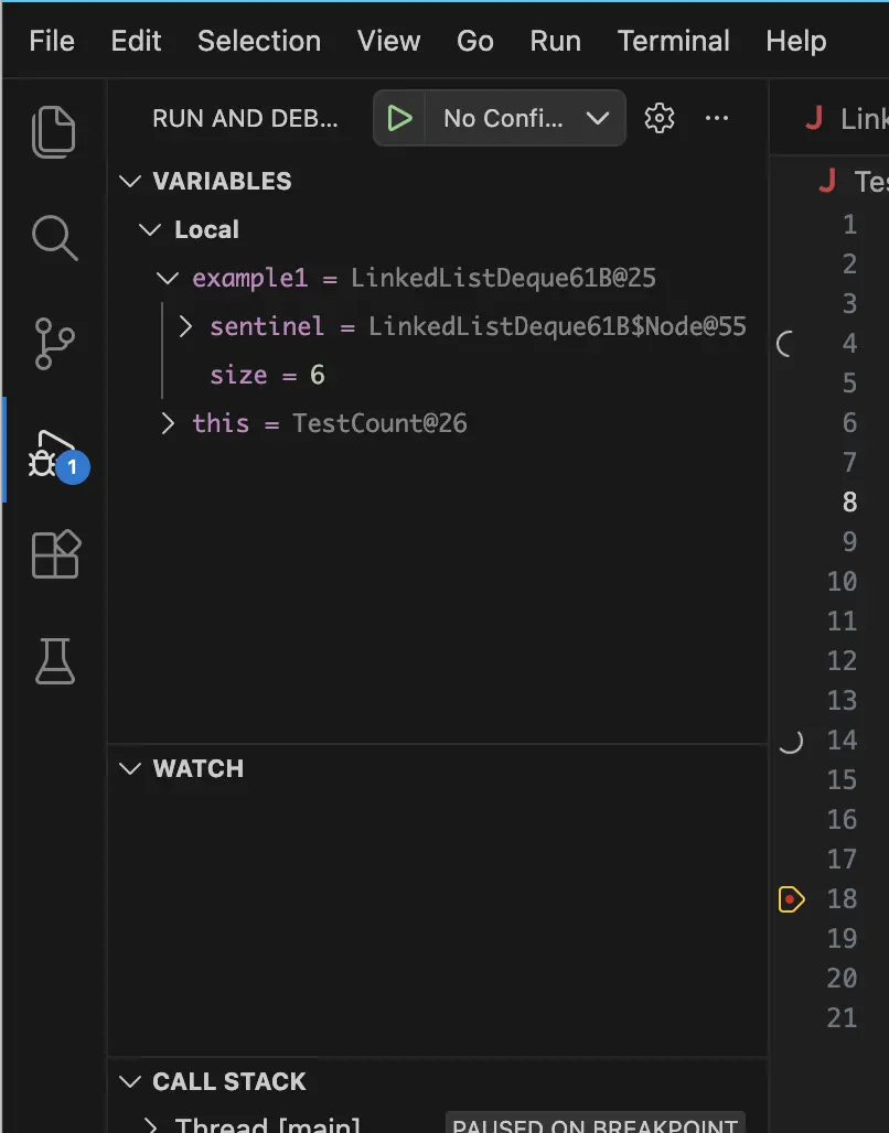 The output of print statements using IO.println() will appear in the DEBUG CONSOLE. In the upper left, you’ll also see a VARIABLES and WATCH section. In the VARIABLES section, you can see the values of variables in your current frame. In the WATCH section, you can input names of variables or expressions, which will be evaluated throughout your debugging session as you step around your code.
