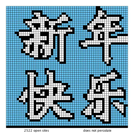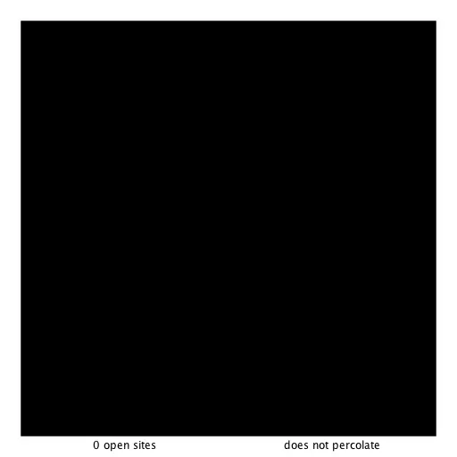 For example, if sites are opened in a 20-by-20 grid according to the snapshots below, then our estimate of the percolation threshold is 204/400 = 0.51 because the system percolates when the 204th site is opened. The images correspond to the 50, 100, 150, and 204 sites being open, respectively.