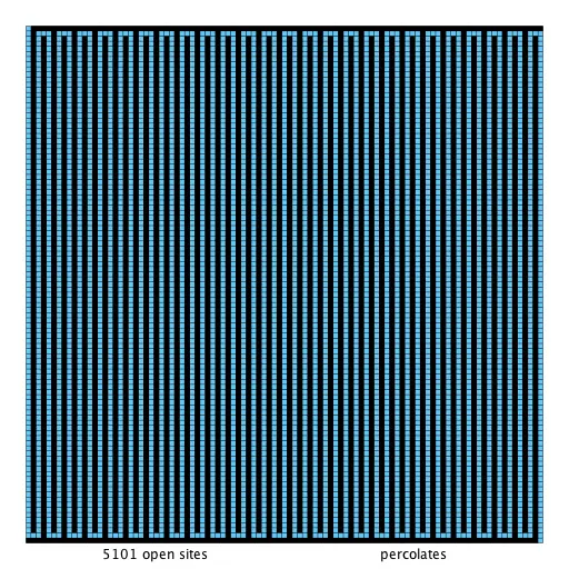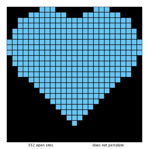 As you start testing Percolation, you might realize that after the system has percolated, PercolationVisualizer colors in light blue all sites connected to open sites on the bottom (in addition to those connected to open sites on the top).