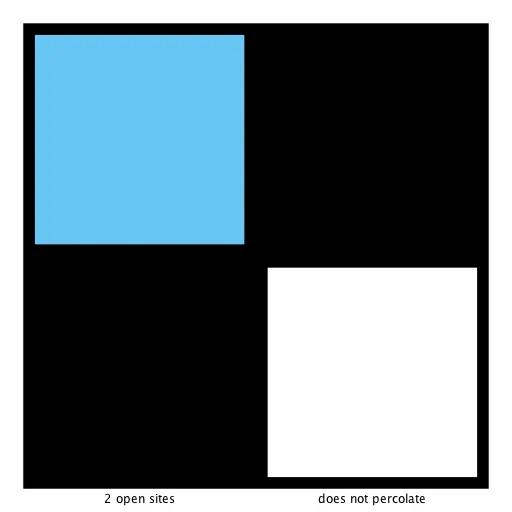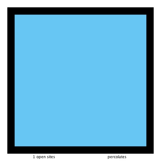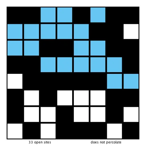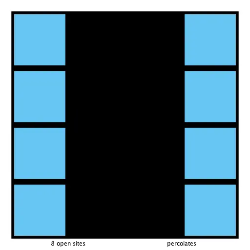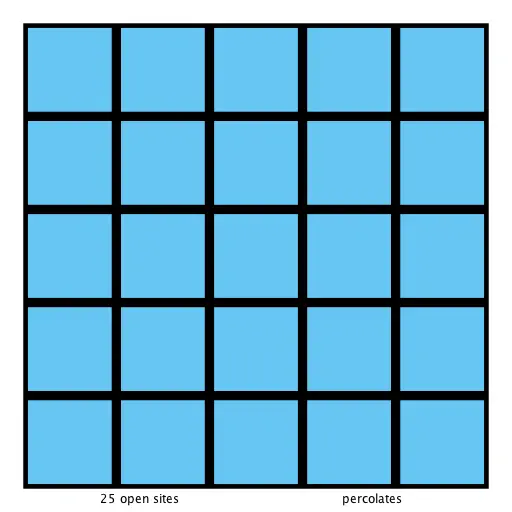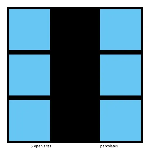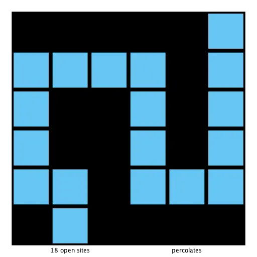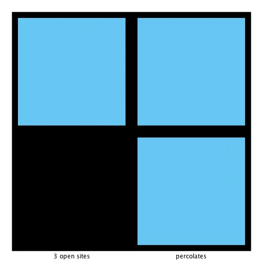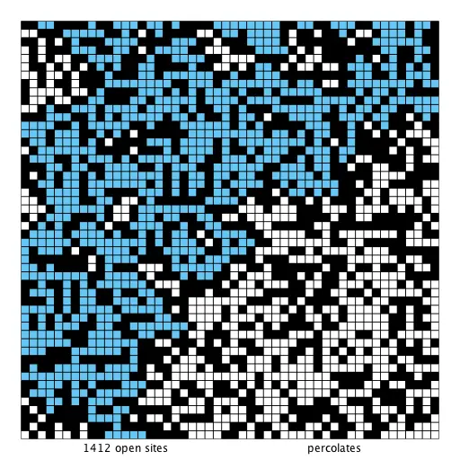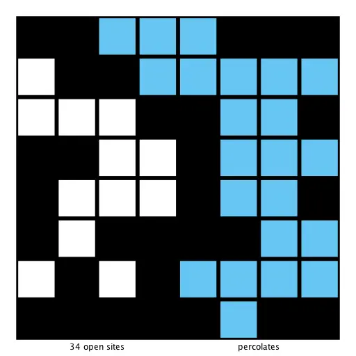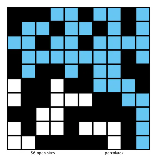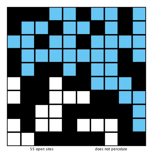 We model a percolation system using an N-by-N grid of sites. Each site is either open or blocked. A full site is an open site that can be connected to an open site in the top row via a chain of neighboring (left, right, up, down) open sites. We say the system percolates if there is a full open site in the bottom row. In other words, a system percolates if we fill all open sites connected to the top row and that process fills some open site on the bottom row. (For the insulating/metallic materials example, the open sites correspond to metallic materials, so that a system that percolates has a metallic path from top to bottom, with full sites conducting. For the porous substance example, the open sites correspond to empty space through which water might flow, so that a system that percolates lets water fill open sites, flowing from top to bottom.)