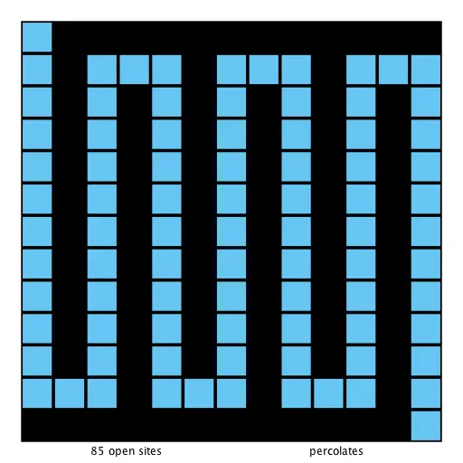 - Read in a sequence of sites (row i, column j) to open from the file. After each site is opened, draw full sites in light blue, open sites (that aren’t full) in white, and blocked sites in black using standard draw, with site (0, 0) in the upper left-hand corner.
