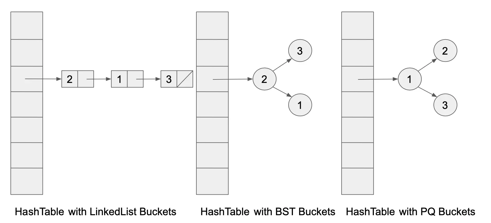 We will try out hash tables with different data structures for each of the buckets, and see empirically if there is an asymptotic difference between using different data structures as hash table buckets.