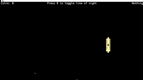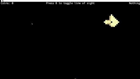 Line of Sight: Create a system so that the tile renderer only displays tiles on the screen that are within the line of sight of the avatar. The line of sight must be able to be toggled on and off with a keypress. Note the line of sight should NOT go through walls although it is fine to be able to wrap around walls/corners. This also means that the line of sight must be long enough such that we can tell if it goes through a wall or not. Here are two examples of line of sight features that we will NOT accept: